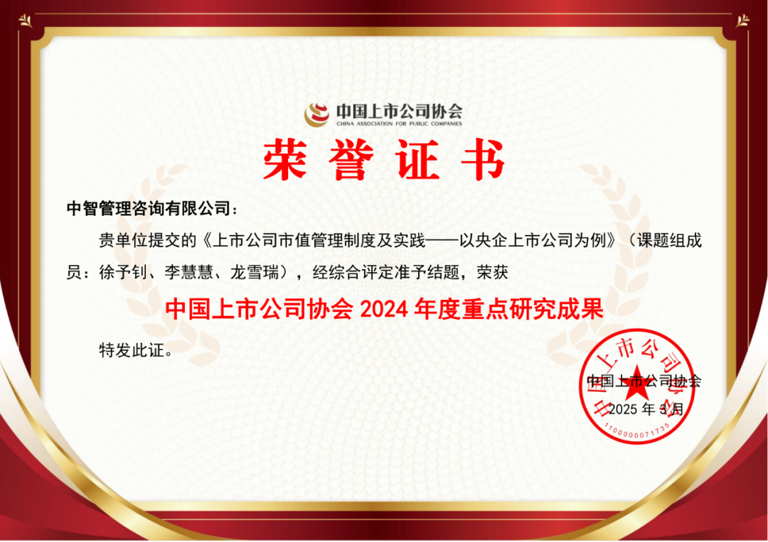 中智管理咨询有限公司研究的《上市公司市值管理制度及实践——以央企上市公司》课题荣获“2024年度重点研究成果”。