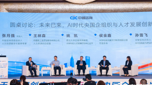 在圆桌对谈环节,张月强与中国核工业建设股份有限公司人力资源部总经理王林森、中国电信天翼支付科技有限公司高级总监侯金鑫、复旦大学姚凯教授及中智咨询合伙人孙雪飞深度交流和探讨。