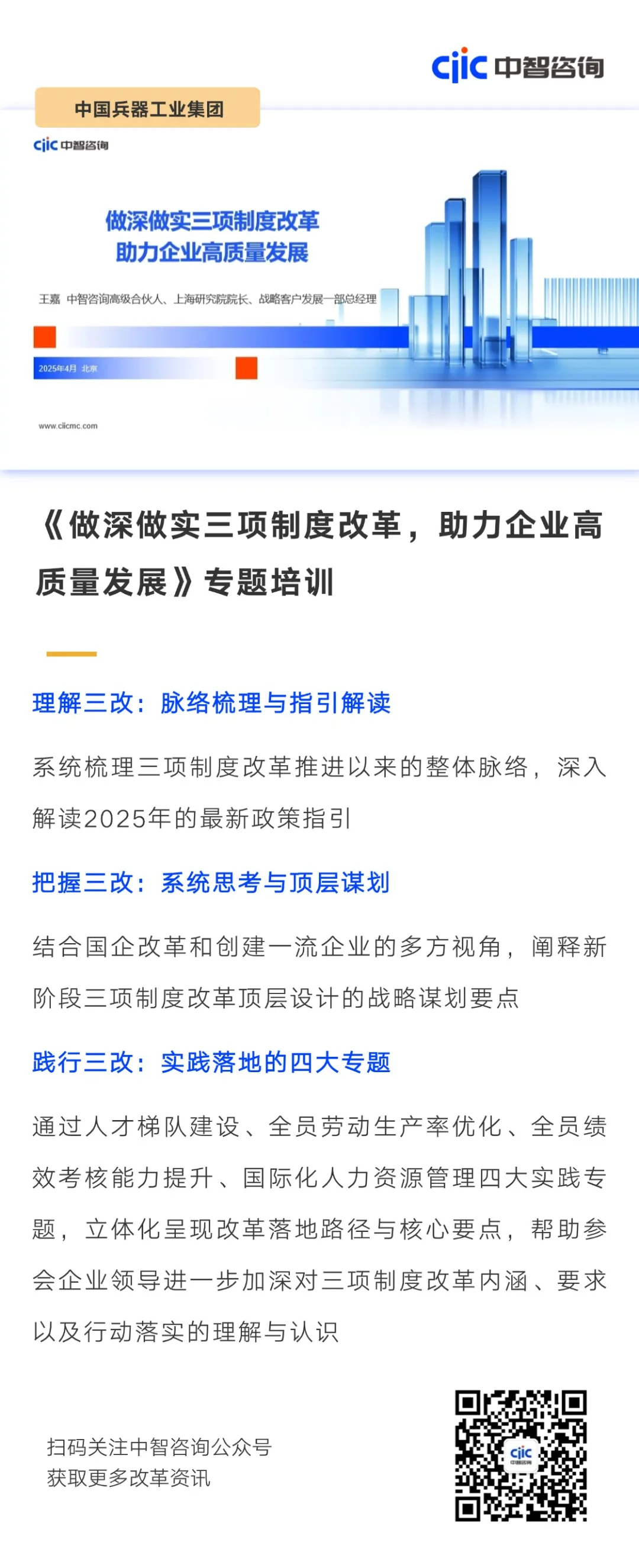 为推进三项制度改革做深做实,响应新阶段、新要求,帮助集团下属企业理解三改、把握三改、践行三改,中国兵器工业集团邀请中智咨询高级合伙人、上海研究院院长、战略客户发展一部总经理王嘉开展《做深做实三项制度改革,助力企业高质量发展》专题培训会。兵器工业集团所属二级单位领导参与本次培训。