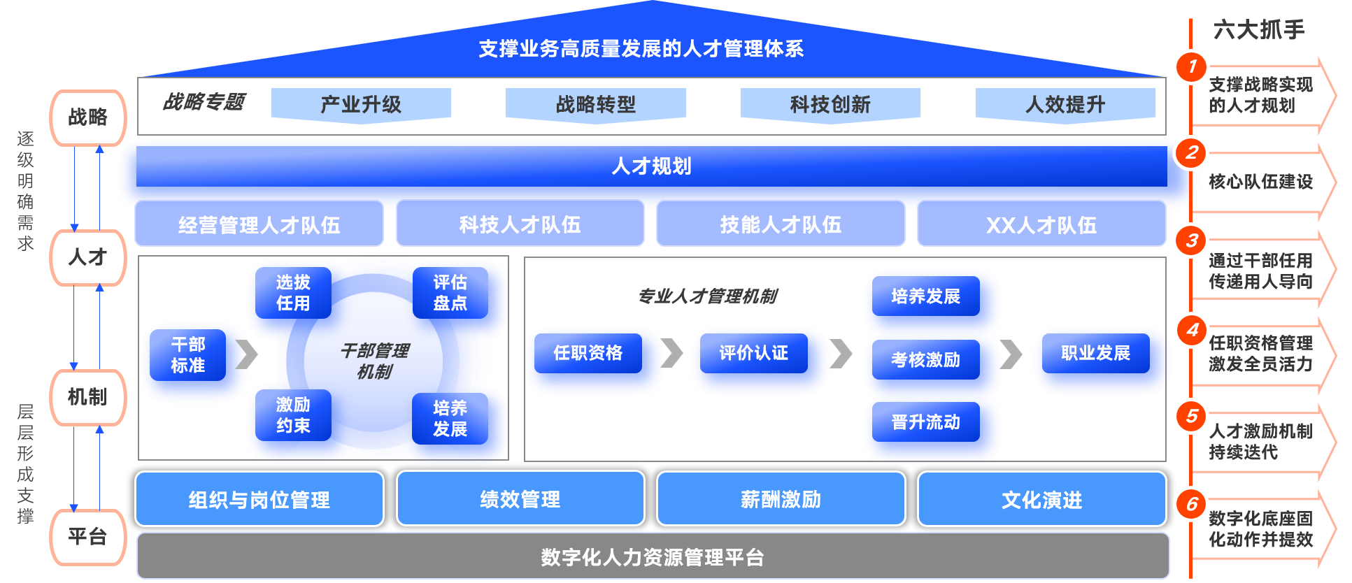 中智咨询帮助企业构建“战略-人才-机制-平台”四位一体的人才管理闭环体系,以战略为引领,通过人才规划与核心人才队伍建设,打通干部管理及专业人才发展双循环,借助激励迭代与体系支撑,驱动组织战略高效落地与人才价值跃升。