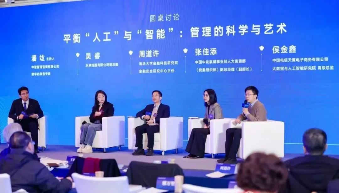 本次平行会议,中智咨询发起以《平衡“人工”与“智能”:管理的科学与艺术》为主题的圆桌讨论环节。圆桌讨论由中智咨询数字化转型咨询总监潘竑主持,清华大学金融科技研究院金融安全研究中心主任周道许、永卓控股有限公司副总裁吴睿、中国中化氯碱事业部人力资源部(党委组织部)副总经理(副部长)张佳添、中国电信天翼电子商务有限公司大数据与人工智能研究院高级总监侯金鑫参与研讨。