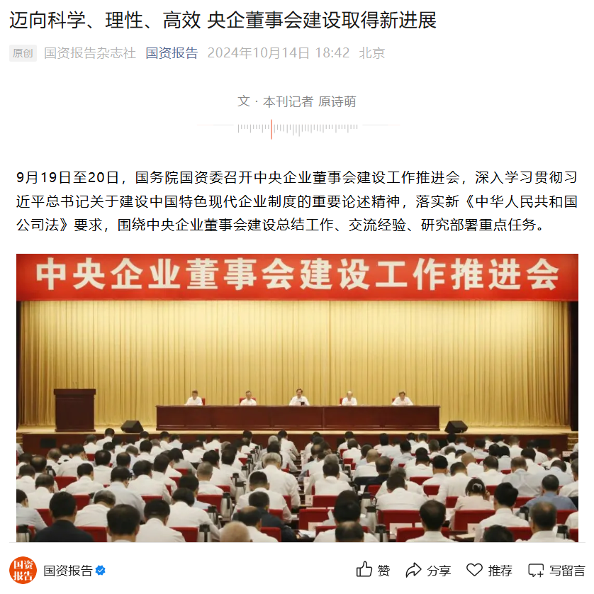 9月19日至20日,国务院国资委召开中央企业董事会建设工作推进会,深入学习贯彻习近平总书记关于建设中国特色现代企业制度的重要论述精神,落实新《中华人民共和国公司法》要求,围绕中央企业董事会建设总结工作、交流经验、研究部署重点任务。