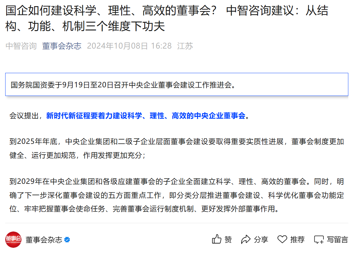 中智咨询认为,“运行高效”是确保国资央企能够顺利实现战略目标、提升核心竞争力和实现可持续发展的重要保障。会议提出“突出效率效果导向”,就是强调中央企业要进一步厘清权责边界、健全决策程序,构建现代化的董事会运行机制,完善董事履职保障机制,确保董事会职权充分执行,从而提升公司治理整体效能。