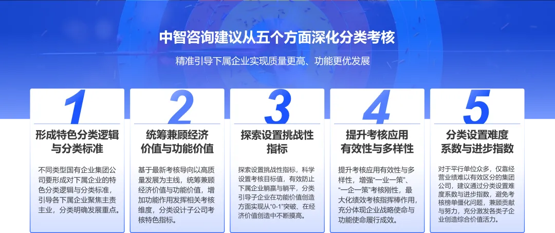 围绕以上五大主要问题,中智咨询建议从五个方面深化分类考核,精准引导下属企业实现质量更高、功能更优发展。