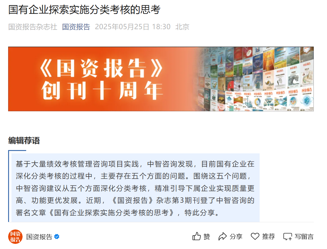 基于大量绩效考核管理咨询项目实践,中智咨询发现,目前国有企业在深化分类考核的过程中,主要存在五个方面的问题。围绕这五个问题,中智咨询建议从五个方面深化分类考核,精准引导下属企业实现质量更高、功能更优发展。近期,《国资报告》杂志第3期刊登了中智咨询的署名文章《国有企业探索实施分类考核的思考》,特此分享。