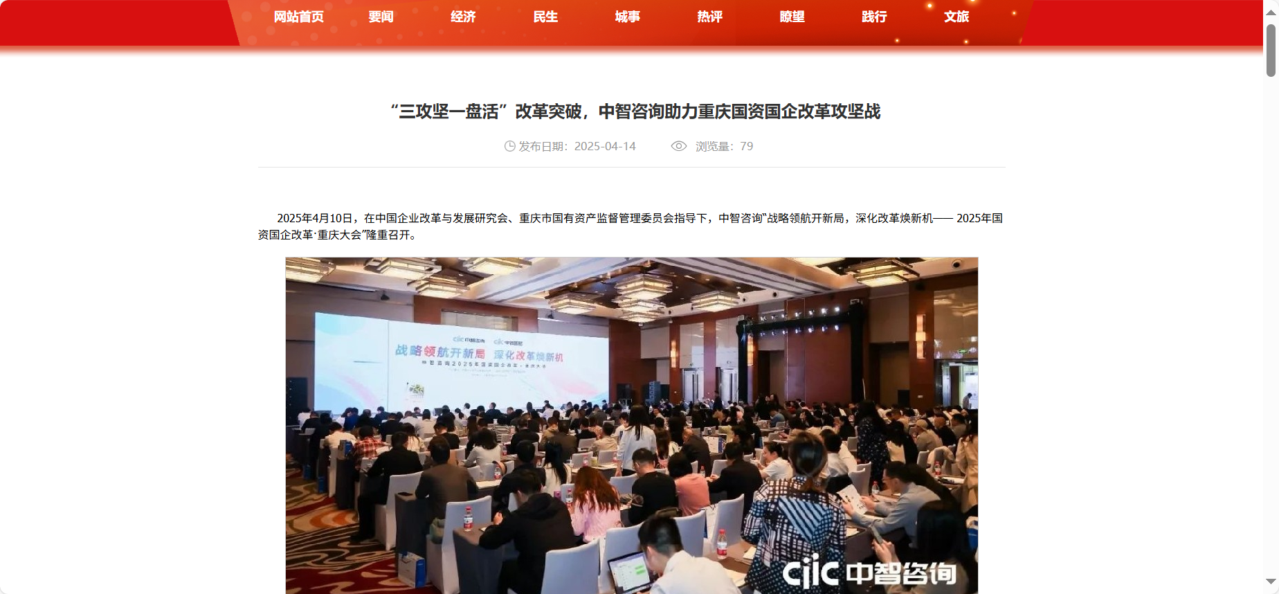2025年4月10日,在中国企业改革与发展研究会、重庆市国有资产监督管理委员会指导下,中智咨询“战略领航开新局,深化改革焕新机—— 2025年国资国企改革·重庆大会”隆重召开。