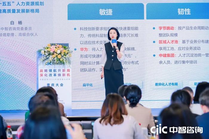 “人才管理创新专场”围绕数智化时代的人才管理革命展开。中智咨询党委委员、总经理助理、高级合伙人白杨详解《以“十五五”人力资源规划,赋能高质量发展新格局》,探索人力资源战略与企业战略的协同路径。她指出,全球产业重构与科技革命加速的复杂环境,将在战略层、组织层、人才层、管理层影响国企人力资源规划。对此她提出,国企要围绕“创世界一流、数字化赋能、国际化转型”三大方面开展人力资源变革与创新,确保人力资源规划与国家战略和企业人才战略的深度融合,为国企高质量发展提供核心人才支撑。