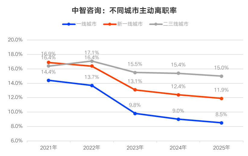 从城市维度来看,新一线城市与一线城市离职率差距进一步缩小。当下,人员流动打破了“单向涌入特大城市”的传统格局,呈现出“均衡分布、就近就业”的新趋势。中智咨询数据显示,2025年北上广深等一线城市的主动离职率是8.5%,新一线城市、二三线城市分别是11.9%、15.0%,新一线和二三线城市的人才回流趋势逐年加强。在流动率整体趋缓的大背景下,相比一线城市,新一线和二三线城市近几年离职率降幅并不明显。