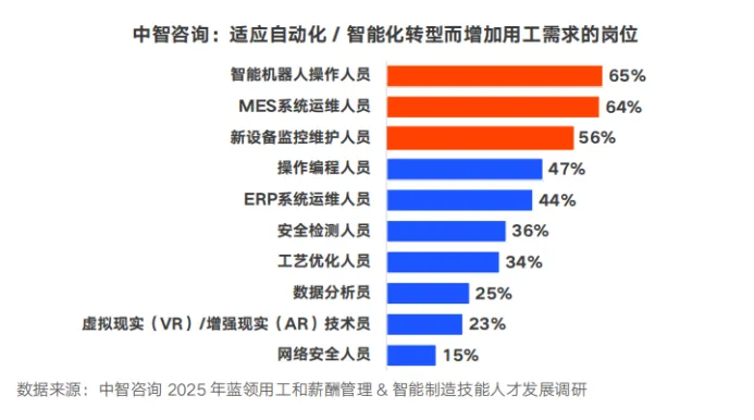 以制造业务工者为例。近些年来,中国制造业正处在从“量的扩张”迈向“质的提升”的关键转型阶段,高技能人才结构性短缺等深层次矛盾日益突出,推动行业进入以“高端化、智能化、绿色化、融合化”为核心特征的高质量发展新阶段。中智咨询《2025年智能制造技能人才发展调研报告》显示,制造企业为适应自动化/智能化转型,增加了智能运维等相关的新岗位用工需求,2025年65%的制造业企业对于智能机器人操作人员用工需求增加。