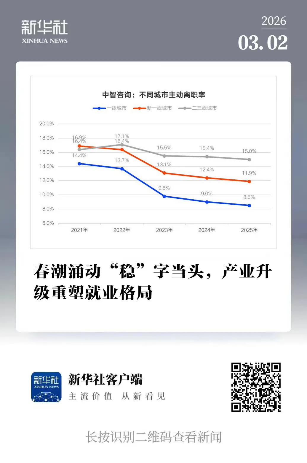 这一数据背后,是宏观经济环境、产业结构调整与就业观念转变共同作用的结果。中智咨询资深研究人员表示,从整体离职趋势看,员工离职行为日益谨慎,主动离职率连续下降,反映了劳动者对“职业稳定性”需求的提升。