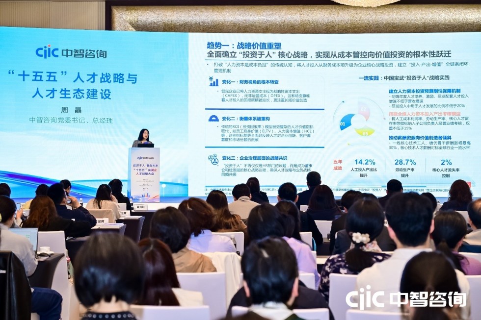 中智咨询党委书记、总经理周晶在会上发布了“十五五”人才战略与生态建设的十大核心趋势,为企业人才工作提供中智思考与未来参考。她提出,“十五五”时期人才战略与人才生态建设,本质上是现代化管理能力体系在人才领域的具体落地。精准把握“十五五”人才工作主线,应聚焦“三大转变”——人才的价值定位转变、体系能力转变、治理升维转变,顺应十大趋势,实现从“传统人才管理”向“现代化人才治理”的系统性变革,真正以“投资于人”构建央企国企人才新格局。