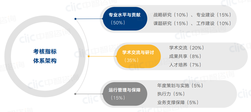 C企业研究院按照“分层分类、差异培养、量化考核、动态管理”思路,遵循“系统性、科学性、导向型、层次性”原则,构建专家队伍、领军人才、科研骨干、青年科技人才的考核指标体系。