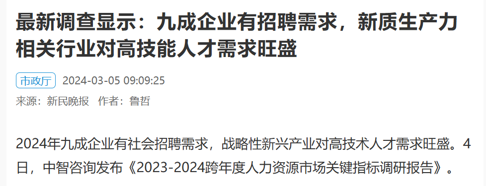 2024年九成企业有社会招聘需求,战略性新兴产业对高技术人才需求旺盛。4日,中智咨询发布《2023-2024跨年度人力资源市场关键指标调研报告》。
