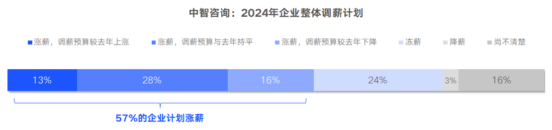 调研结果显示,57%的企业在2024年有调薪计划,占比较上年下降了9个百分点。随着经济形势的波动和市场竞争的加剧,一些企业可能面临着更大的经营压力,因此在薪酬方面的支出会受到一定程度的限制。