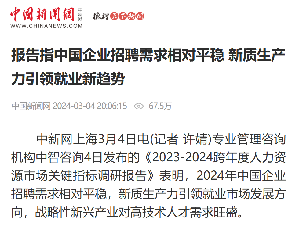 新质生产力引领就业市场发展方向,新能源新材料、先进制造、电子信息、医药生物等战略新兴产业催生了新的就业机会和人才需求。