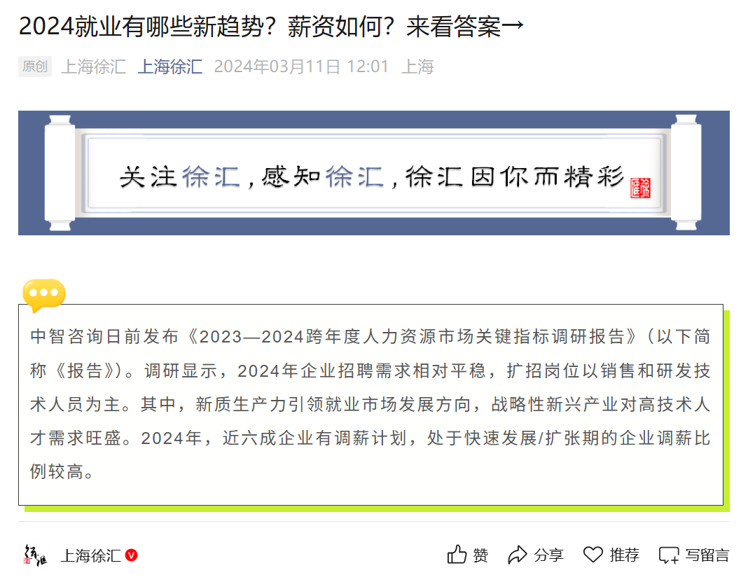 中智咨询日前发布《2023—2024跨年度人力资源市场关键指标调研报告》(以下简称《报告》)。调研显示,2024年企业招聘需求相对平稳,扩招岗位以销售和研发技术人员为主。其中,新质生产力引领就业市场发展方向,战略性新兴产业对高技术人才需求旺盛。2024年,近六成企业有调薪计划,处于快速发展/扩张期的企业调薪比例较高。