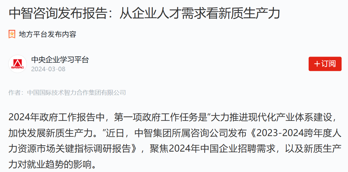 2024年政府工作报告中,第一项政府工作任务是“大力推进现代化产业体系建设,加快发展新质生产力。”近日,中智集团所属咨询公司发布《2023-2024跨年度人力资源市场关键指标调研报告》,聚焦2024年中国企业招聘需求,以及新质生产力对就业趋势的影响。