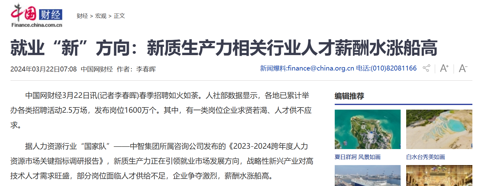 据人力资源行业“国家队”——中智集团所属咨询公司发布的《2023-2024跨年度人力资源市场关键指标调研报告》,新质生产力正在引领就业市场发展方向,战略性新兴产业对高技术人才需求旺盛,部分岗位面临人才供给不足,企业争夺激烈,薪酬水涨船高。