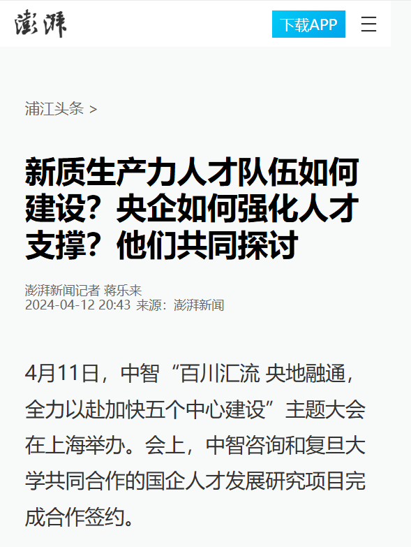 4月11日,中智“百川汇流 央地融通,全力以赴加快五个中心建设”主题大会在上海举办。会上,中智咨询和复旦大学共同合作的国企人才发展研究项目完成合作签约。