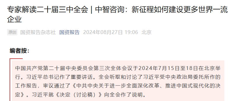 为了更好地宣传贯彻党的二十届三中全会精神,2024年8月1日出版的《国资报告》第一时间组织专家学者、中央企业,结合自身体会,对会议精神进行深入解读。