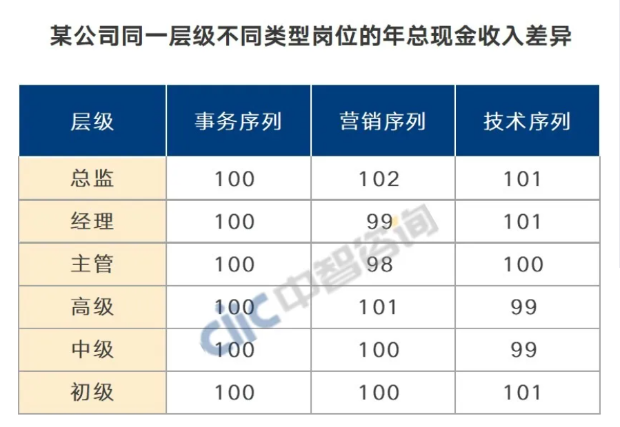 下图就展示了某公司同一层级不同类型岗位的年总现金收入差异,以事务序列为基准值100,其他序列的薪酬水平略有上下浮动,差异极小。