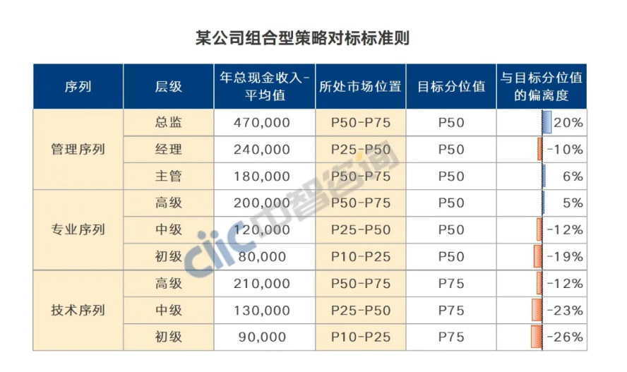 以下图为例,该公司采用组合型策略——管理序列和专业序列人员为跟随型,对标市场P50水平;技术序列人员为领先型,对标市场P75水平。