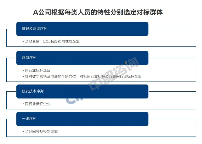 为了实现全面且精准的对标,家电行业某标杆企业A公司将集团内员工划分为管理及职能序列、营销序列、研发技术序列、一线序列4大类,根据每类人员的特性分别选定对标群体。