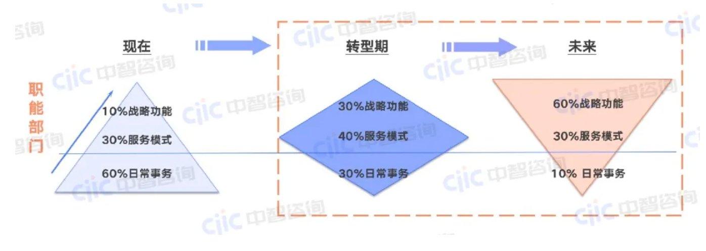 矩阵式组织是项目管理的必然选择。矩阵式组织,就是按职能划分和按产品、业务等划分部门相结合的一种组织结构形式。资源部门按专业进行分工,有利于员工专业能力的提高;有利于队伍的稳定和任职资格的管理,让优秀人员脱颖而出。在组织变革过程中,中后台应同业务部门的变化调整同步开展变革。一方面是自身定位的调整变化,从“金字塔型”逐步到“菱形”再到“倒金字塔”,从关注日常事务到更多的关注战略功能和服务工作,职能部门需要匹配业务发展需要,梳理服务意识,更加注重赋能业务、服务业务。