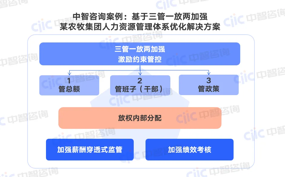 该集团由省内多家农牧企业整合组建,业务覆盖全产业链,内部多套管理体系并行,人才家底不清晰。结合两类模型的核心逻辑,解决方案聚焦“三管一放两加强”:
