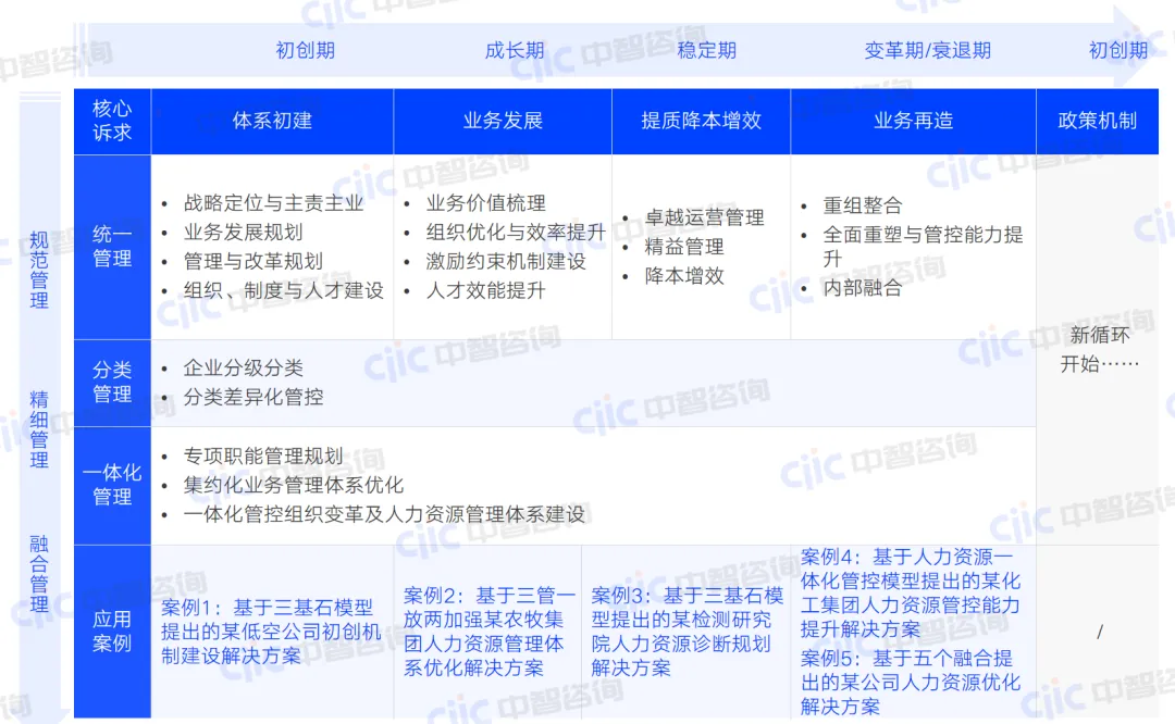 结合企业初创期、成长期、变革期(整合重组期)的核心需求,中智咨询给出框架应用建议以及相应的实践案例参考。