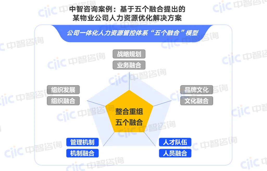 应用中智咨询“五个融合”模型(业务融合、组织融合、机制融合、人才融合、文化融合)设计解决方案,方案聚焦: