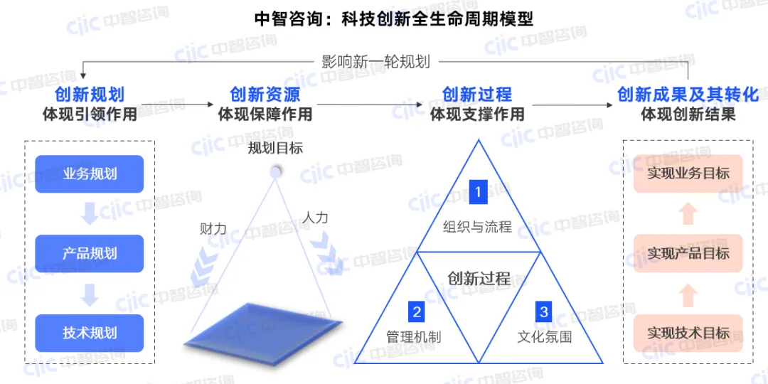 从横向来看,企业的科技创新规划涉及到财务资产、组织机构、人力资源、企业文化等多个方面,不能由科技管理独立而为,必须建立在横向部门协同的基础上。 从纵向来看,科技创新规划必须深度融入企业经营,必须能够充分支撑企业的业务规划,技术研发紧密衔接产品和业务经营。