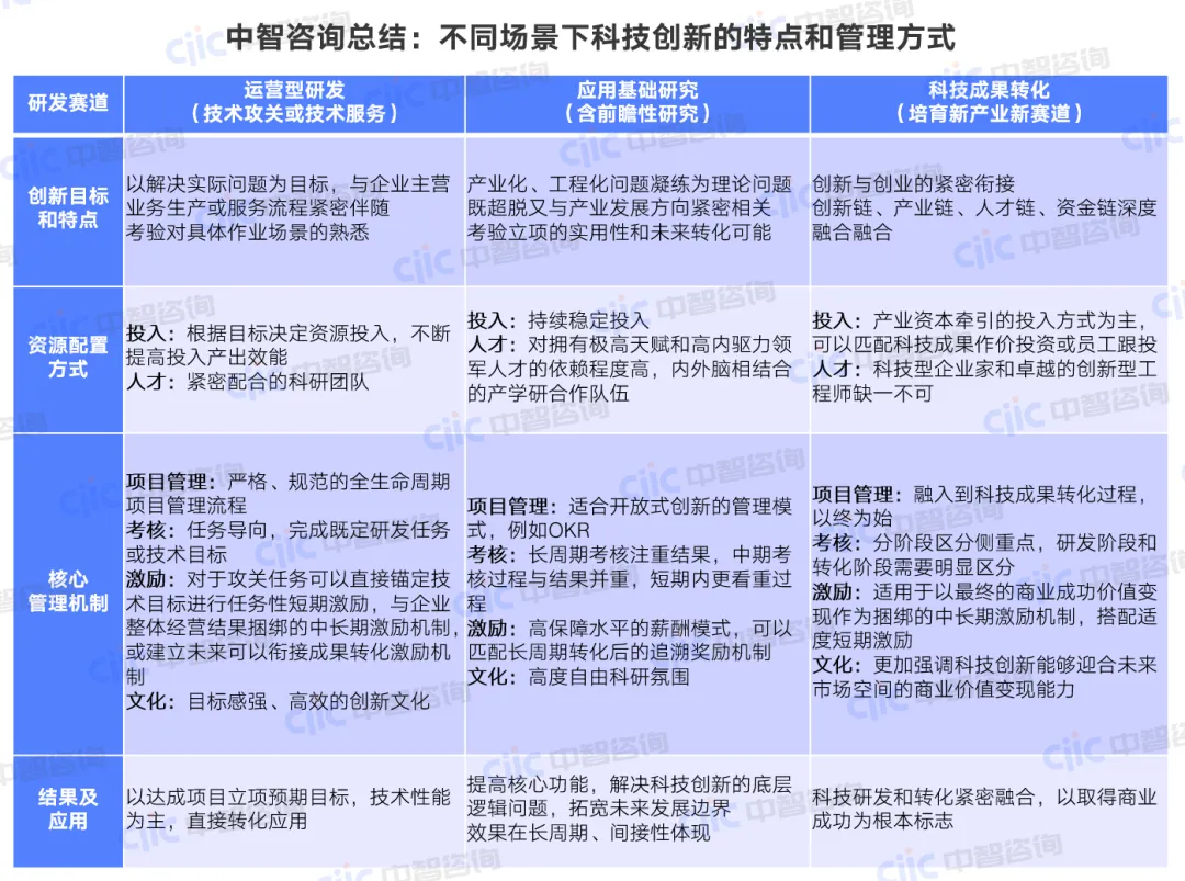 第一类是运营型研发,在传统工业类企业中普遍存在,其特点是紧密伴随企业生产或服务过程,是国有企业科技创新的传统形态,大部分企业有比较深厚的经验积累。 第二类是应用基础研究,近年科技体制机制改革的重点方向之一,过去在企业较少布局,但对大型企业的长期技术竞争力有深层次影响。 第三类是以培育新产业新赛道为目标、更需要“四链融合”发展的科技成果转化,可以为国有企业加快形成新质生产力。
